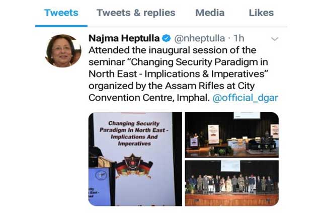 The Chief Guest, Dr Najma Heptulla, Hon’ble Governor of Manipur, in her keynote address, emphasized on the urgent need to arrive at the way forward for peace and prosperity in Manipur by amalgamation of divergent views from varied sections of the society. This could lead to Manipur rightly becoming the “Nongpok Thong” or the Gateway to South East Asia.